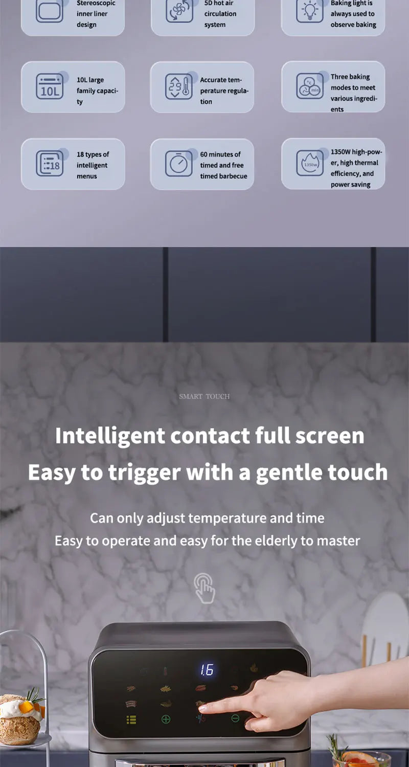 Freidoras de aire eléctricas de gran capacidad de 10L, cocina doméstica automática sin aceite 360 ° Horno de convección para hornear freidora sin aceite