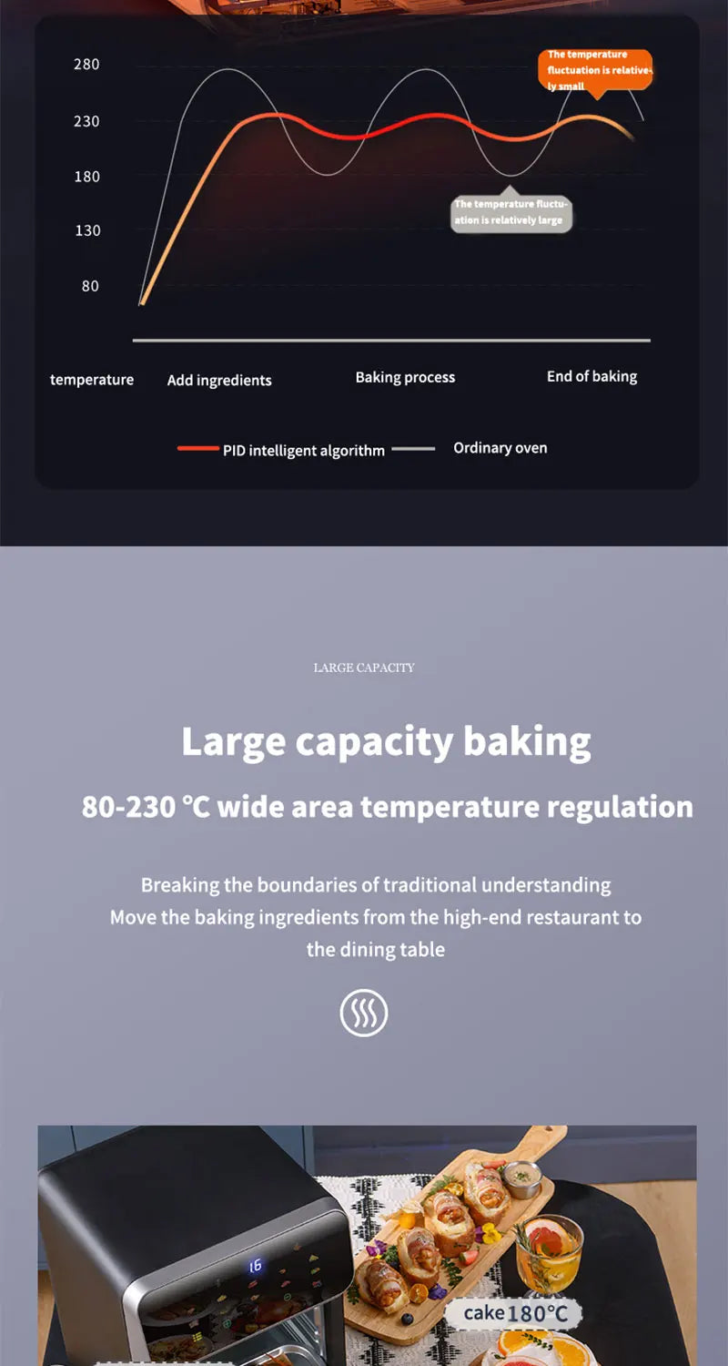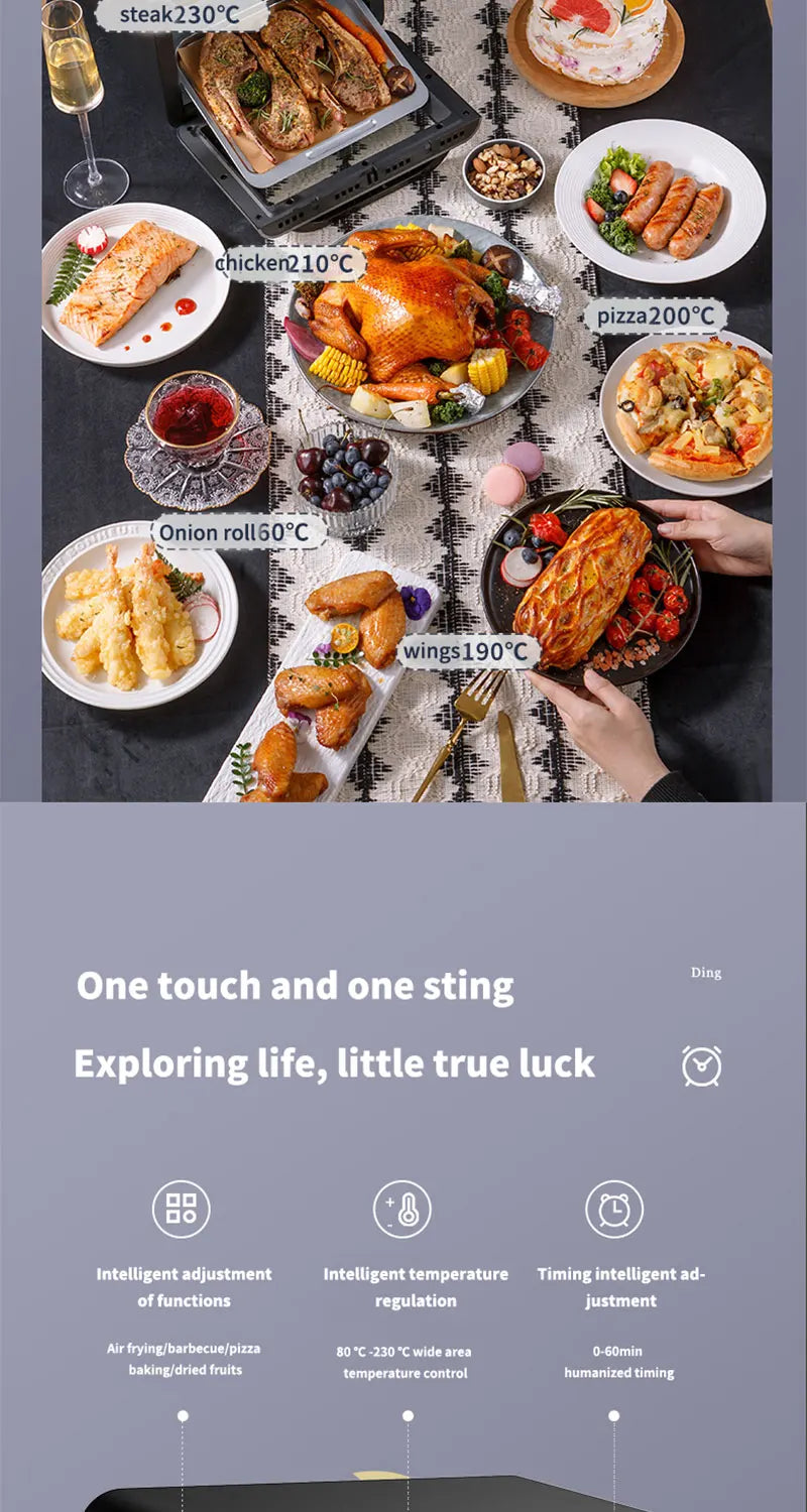 3.Multifunción: horneado integrado y fritura al aire, sin voltear, aire caliente que circula 360 grados.