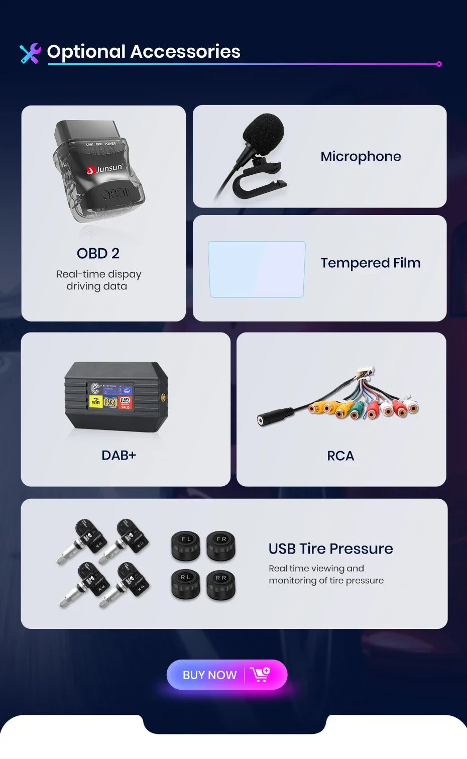 >>La radio Junsun admite CarPlay inalámbrico y Android Auto, lo que le permite utilizar funciones y aplicaciones del teléfono inteligente como navegación, música, llamadas y mensajería durante su viaje.Proporciona una experiencia de audio de alta calidad, mejorando el entretenimiento y la comodidad de su experiencia de conducción.