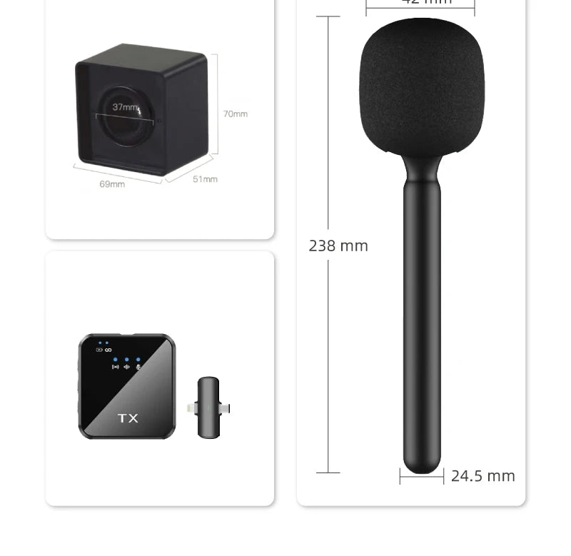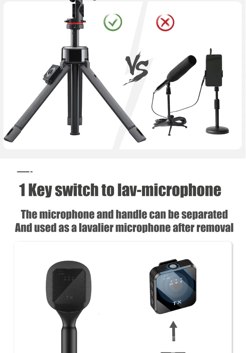 - Uso versátil: Cuenta con un interruptor de 1 tecla para convertir entre un micrófono de mano y un micrófono de solapa.El micrófono y el mango se pueden separar, lo que proporciona flexibilidad para diferentes configuraciones de grabación.