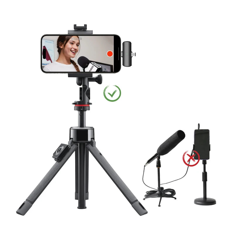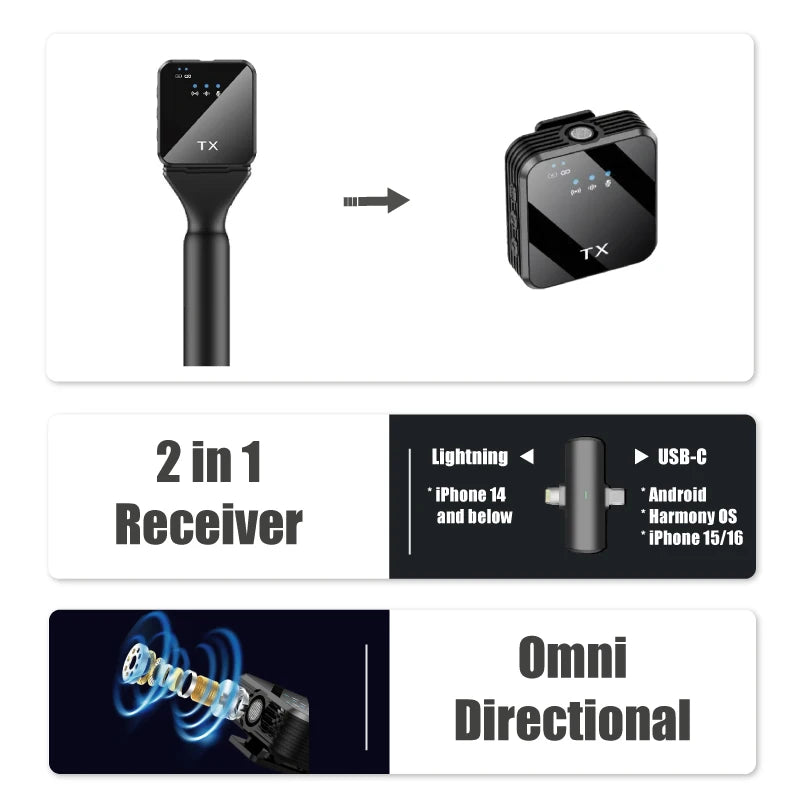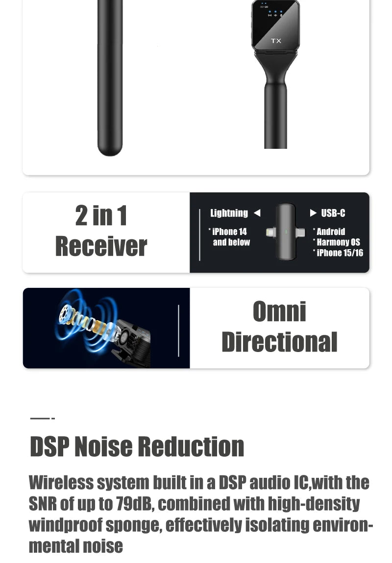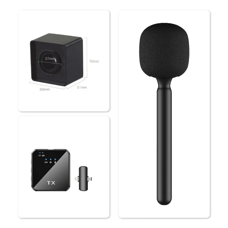 - Libertad inalámbrica: utiliza tecnología inalámbrica 2,4G, lo que le permite moverse libremente durante la grabación sin la molestia de los cables.Es compatible con teléfonos inteligentes iOS y Android, lo que lo hace altamente compatible.