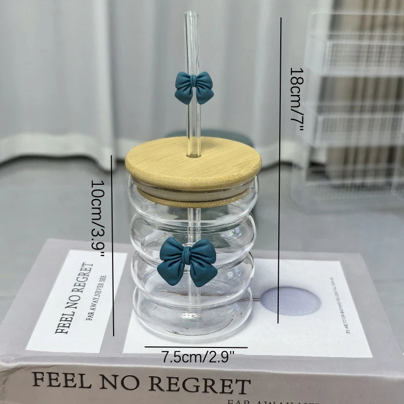Taza de agua bonita con lazo, vaso de cristal con lazo de dibujos animados, taza de café con garabatos bonitos a rayas, fruta para el hogar, té, limonada, regalo para niñas