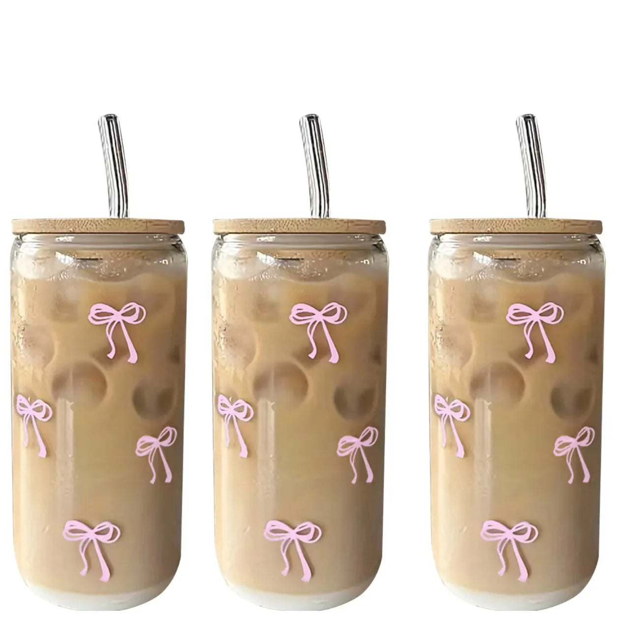 Taza de cristal con lazo bonito de 500ml, botella de agua con patrón de oso, tazas de café con tapas, cepillo de paja, regalo de fiesta del Día de San Valentín