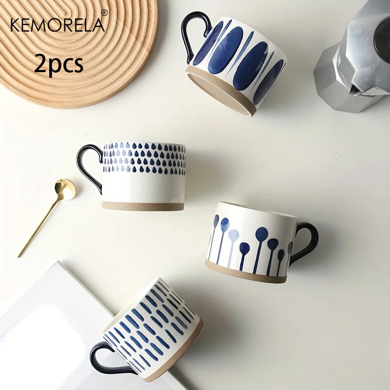 Tazas de café de cerámica pintadas a mano, diseño geométrico azul y blanco, tazas redondas reutilizables seguras para microondas para café, té y avena, 2 uds.