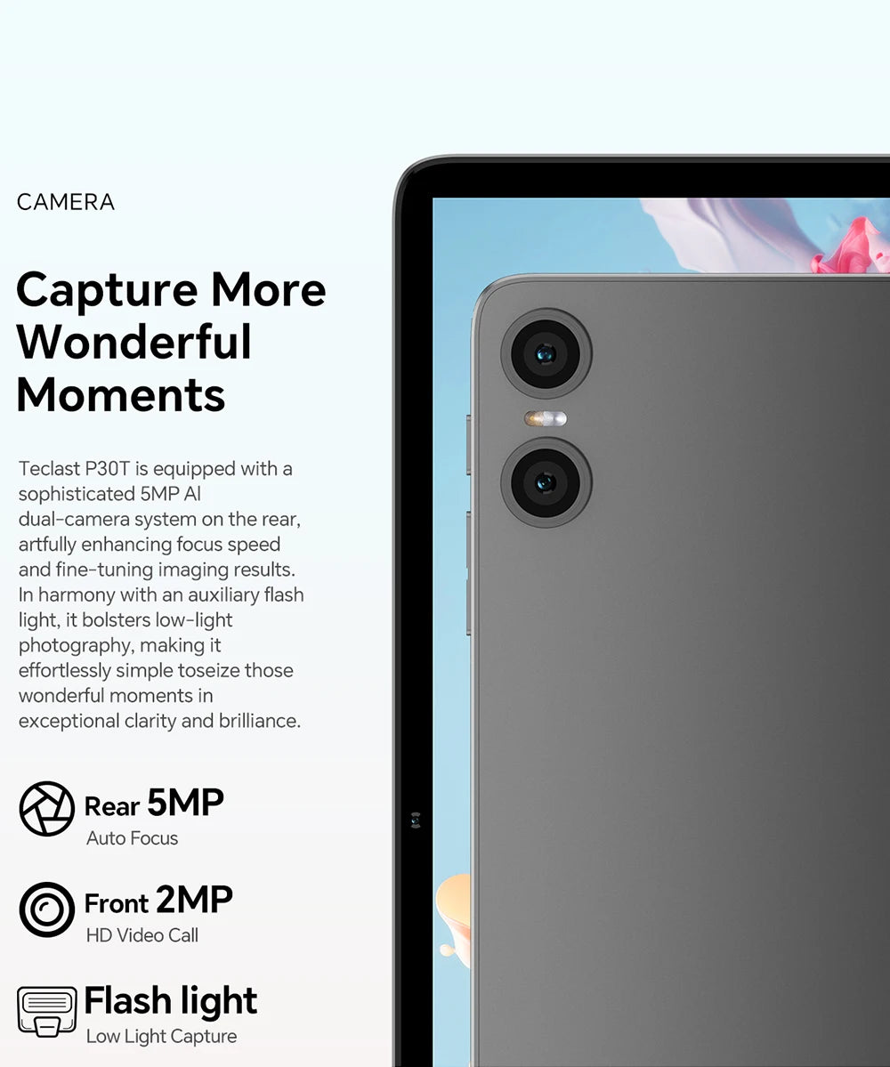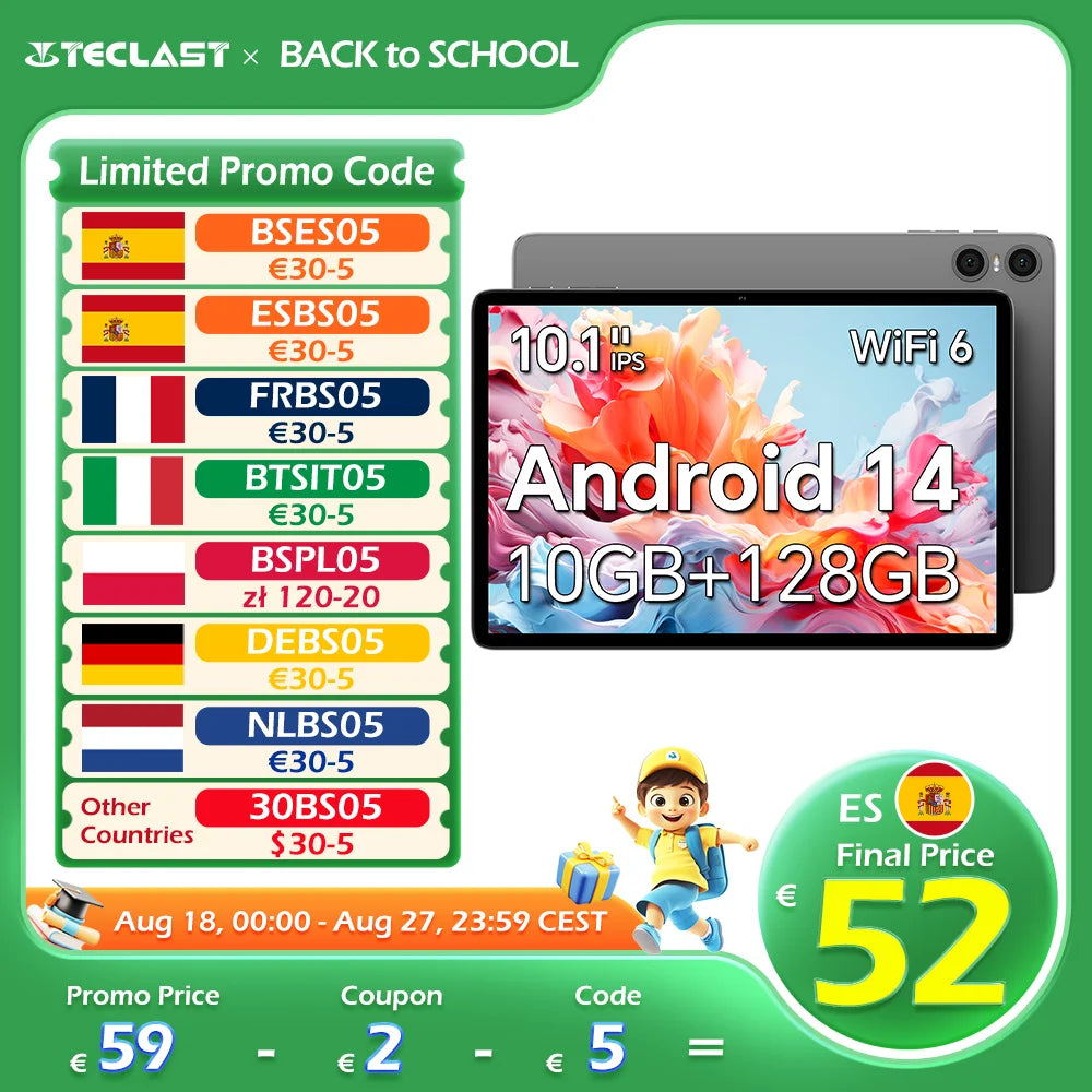 Teclast P30T Tableta, 10,1 pulgadas 1280x800, Android 14, Wi-Fi 6, Unisoc T606 Octa Núcleo, (4GB+6GB)10GB de RAM, 128GB de ROM(Soporte TF 1TB), 5MP+2MP, 6000mAh, Type C, Mali G57