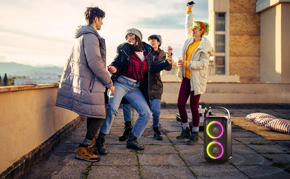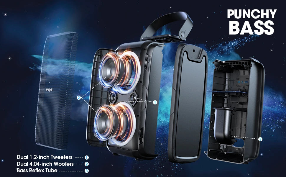 • ♫👍Bass Reflex Tube Technology& 180W PEAK High Power: W-KING T9-2 180W PEAK bluetooth speaker adopts an advanced bass reflex tube to ensure deep and resonant bass, which enhances the overall audio experience, allowing us to enjoy a more dynamic and bodily Immersive sound. Additionally, the handle of the outdoor portable Bluetooth speaker allows you to easily carry it, and dance at any time, You'll be the king of the stage. Great as a birthday, Christmas, or holiday gift for kids/family/friends.