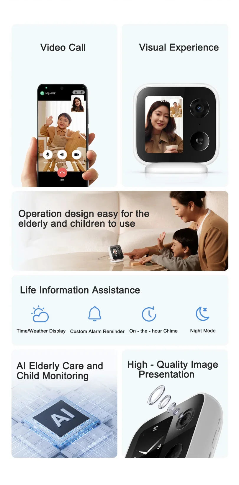 Admite llamadas bidireccionales y video chat.Ya sean sus padres lejos de su ciudad natal o sus hijos regresando de la escuela, siempre que haya una urgencia o un anhelo, puede "reunirse" y charlar con ellos en cualquier momento.